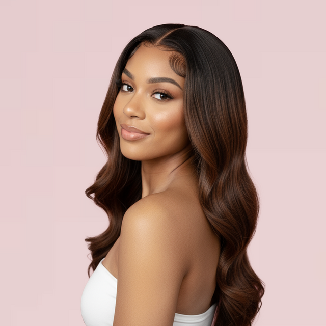 Color: Dark brown roots melting into golden honey blonde with sun-kissed lighter ends