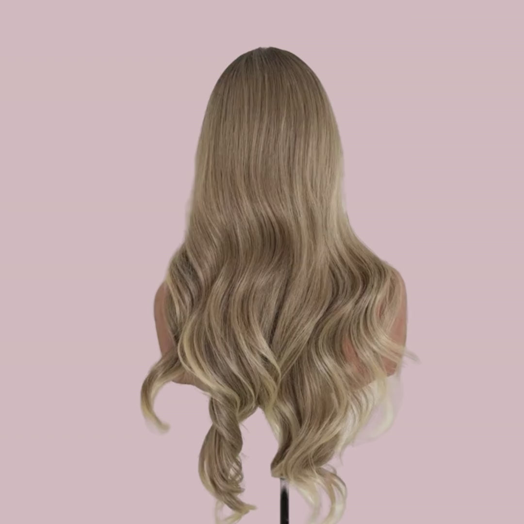Color: Shadow brown rooted, blending into honey blonde with platinum accents at the front and lighter blonde ends